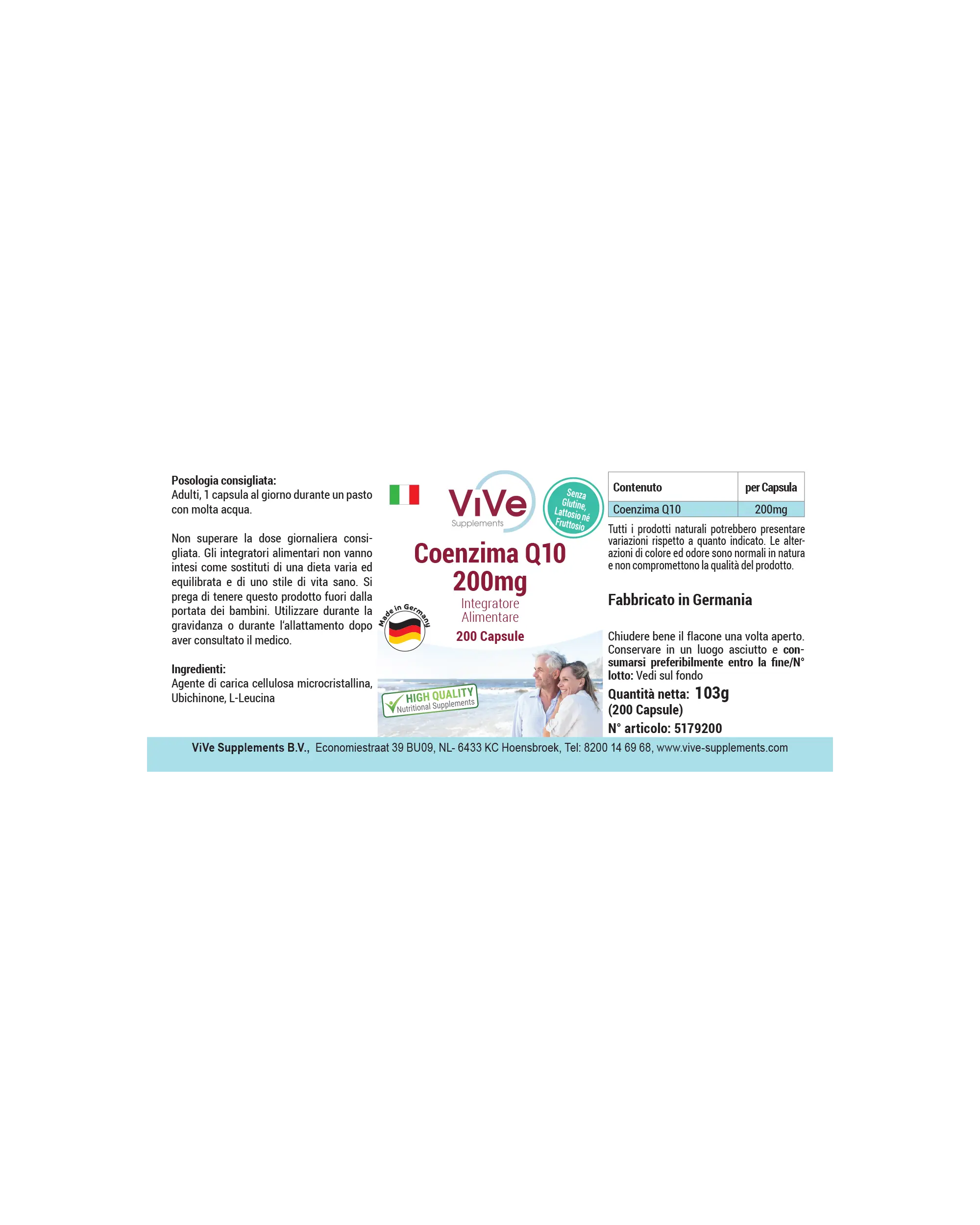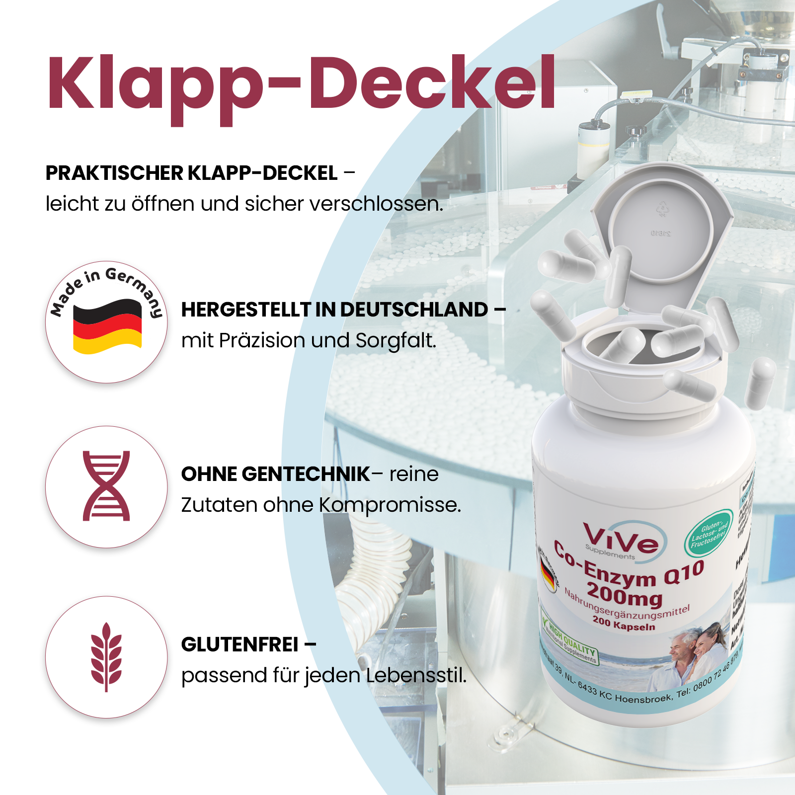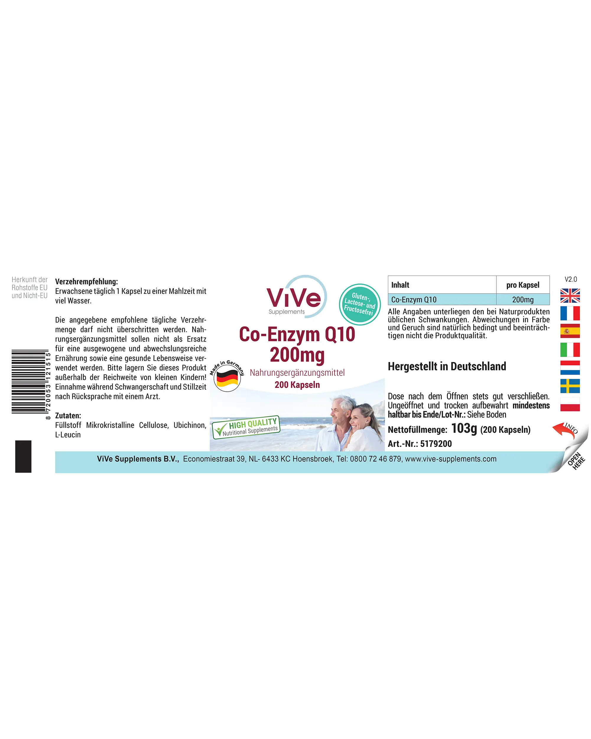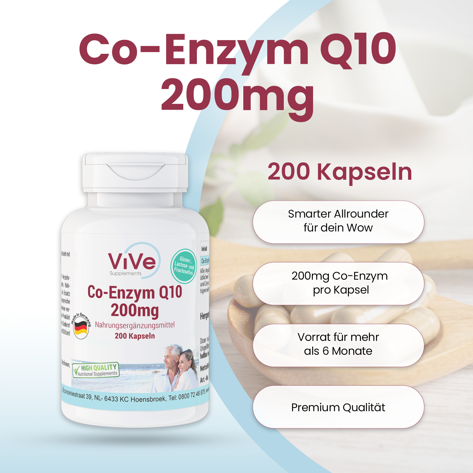 Produktinformationen "Co-Enzym Q10 200mg - 200 Kapseln - schluckfreundlich - Ubichinon - vegan | Vive Supplements"