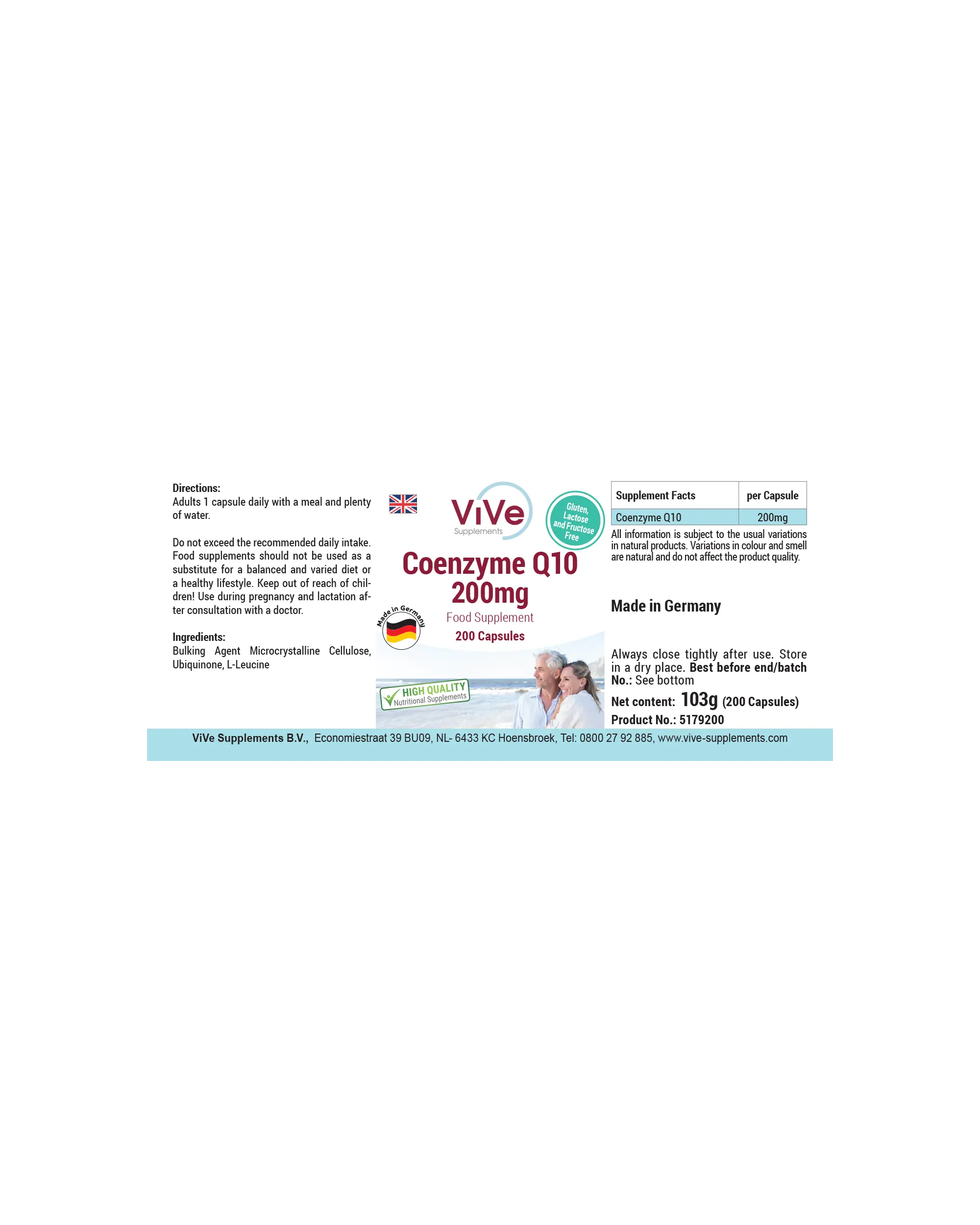 Mit 200 Kapseln pro Packung bietet das Produkt einen praktischen Vorrat für eine langfristige Einnahme. Die schluckfreundlichen Kapseln enthalten neben Ubichinon die Füllstoffe mikrokristalline Cellulose sowie L-Leucin. Die Rezeptur ist gluten-, laktose- und fructosefrei. Hergestellt wird das Produkt unter strengen Qualitäts- und Hygienestandards.