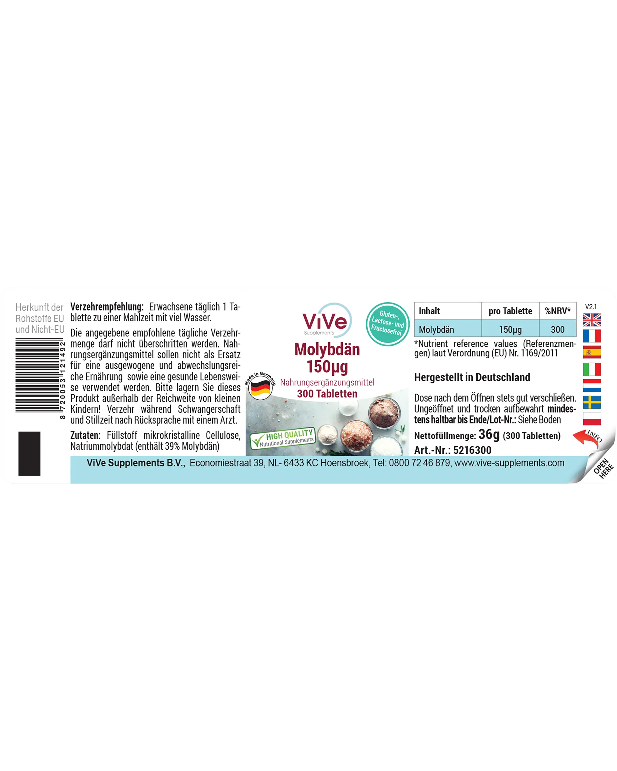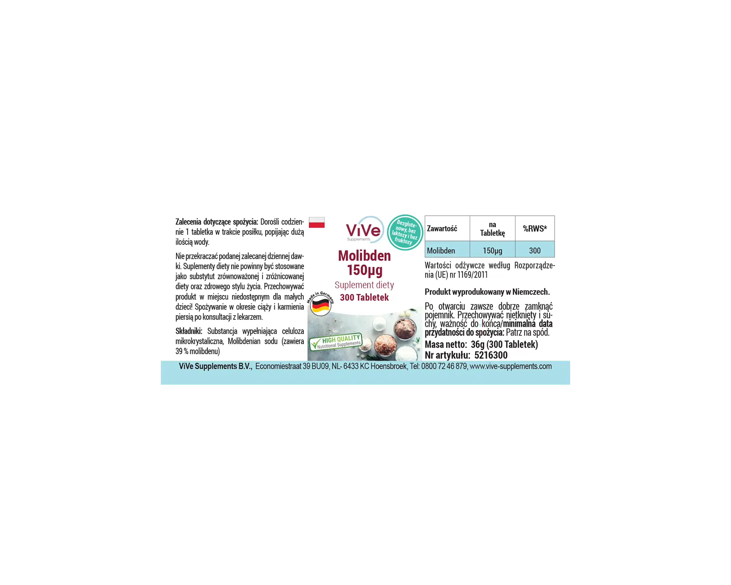 Produktinformationen "Molybdän 150µg - 300 Tabletten | Vive Supplements"