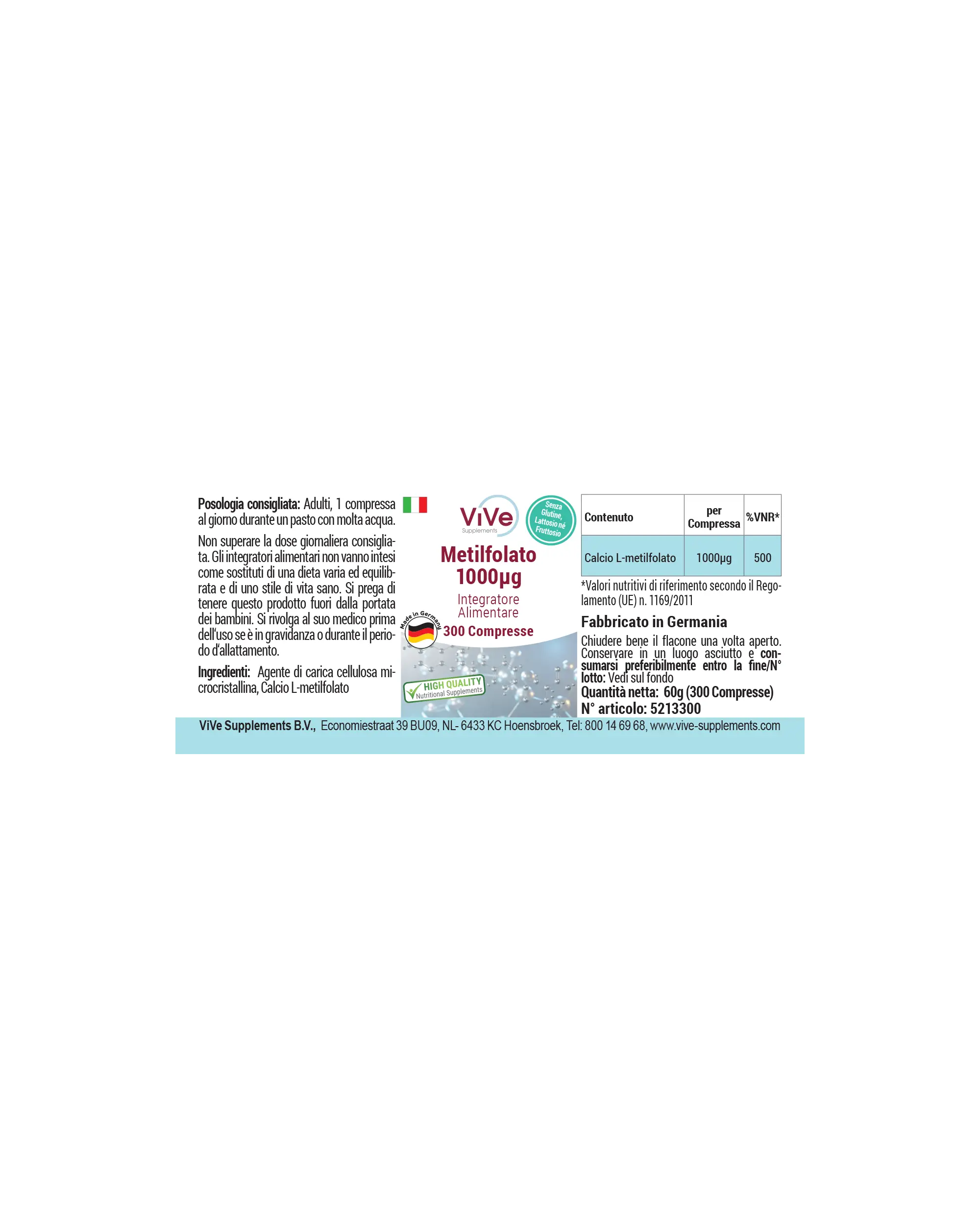 Enthalten sind Calcium-L-Methylfolat sowie mikrokristalline Cellulose als Bestandteil der Formulierung. Die Packung umfasst 300 Tabletten.