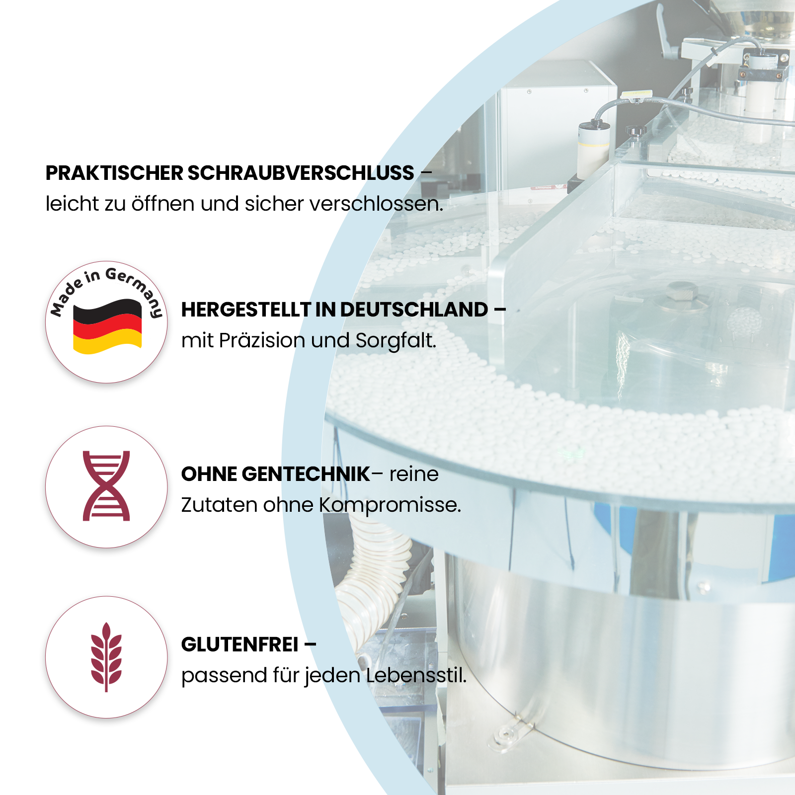 The recommended daily consumption must not be exceeded. Food supplements should not be used as a substitute for a balanced and varied diet and a healthy lifestyle. Please store this product out of the reach of small children! Not suitable for pregnant or breastfeeding women.