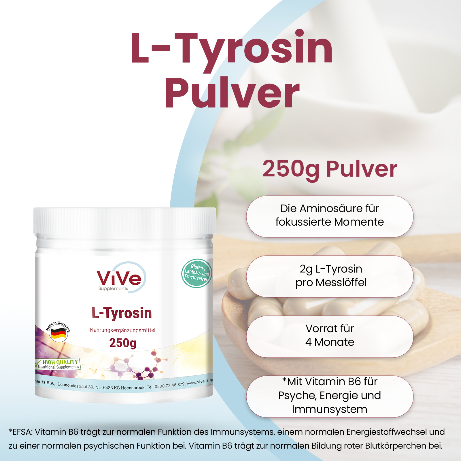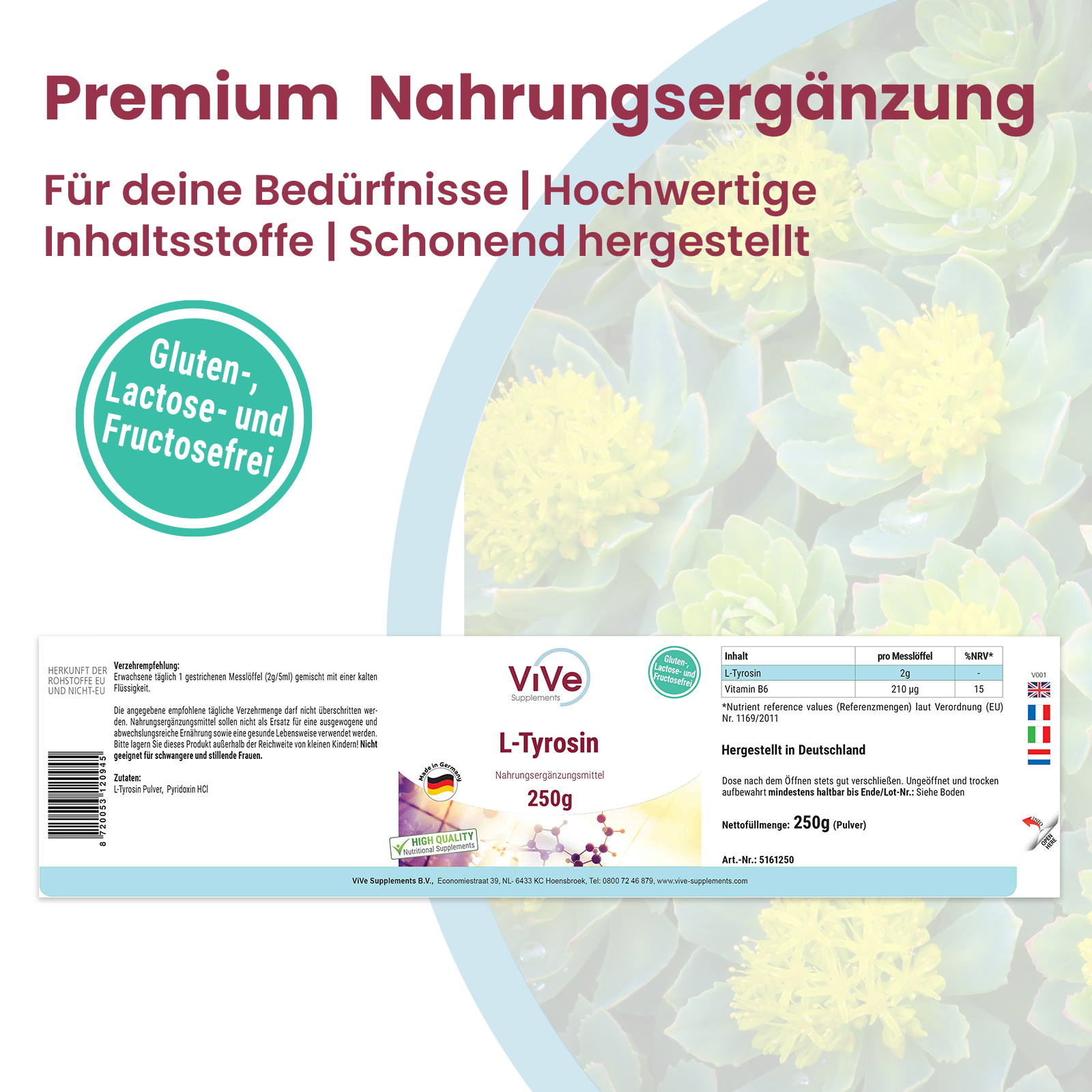 L-Tyrosine Powder 250g from Vive Supplements, enriched with vitamin B6, is a dietary supplement that contains a concentrated amount of the amino acid tyrosine. Tyrosine is a building block for neurotransmitters and other protein-containing compounds in the body. The addition of vitamin B6 promotes the optimal use of tyrosine in the body