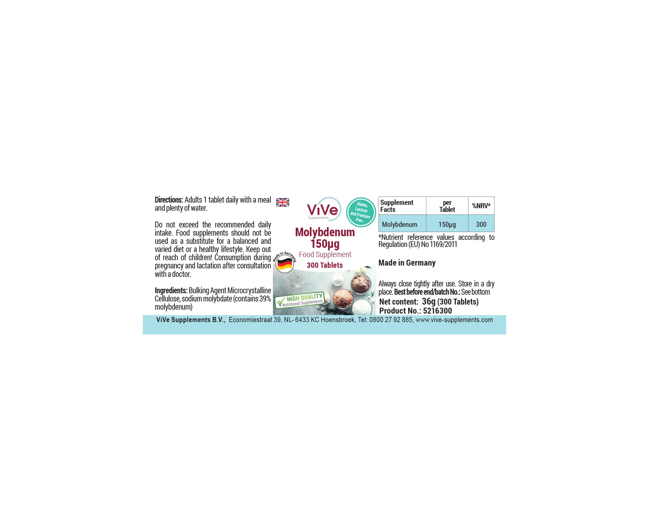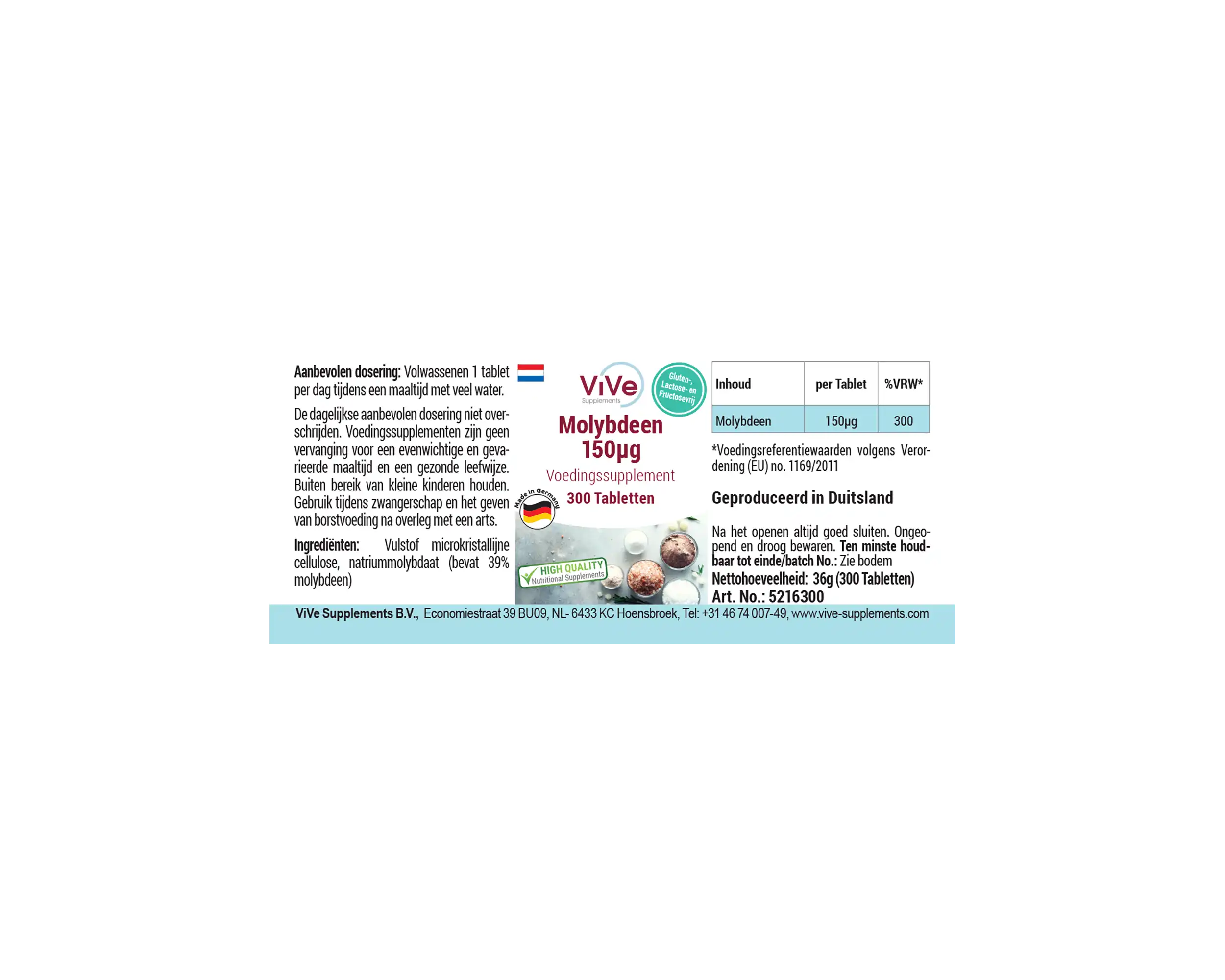De molybdeentabletten van Vive Supplements bevatten 150 µg molybdeen per tablet. Met 300 tabletten biedt de verpakking een lange termijnvoorraad in handig tabletformaat. De formule is veganistisch en vrij van kleur- en hulpstoffen.